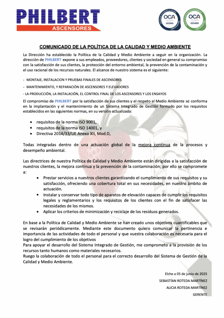 Además, PHILBERT ASCENSORES está comprometida con su política de Calidad Medio Ambiente, implantando sistemas de gestión de la Calidad y Medioambiente basado en las Normas Internacionales UNE-EN-ISO 9001 y UNE-EN-ISO 14001, cumpliendo con lo establecido en la Ley 26/2007, de 23 de octubre, de Responsabilidad Medioambiental, vigente actualmente en España. El objetivo de estas políticas es garantizarte un servicio de calidad mientras que se mantiene un elevado equilibrio entre desarrollo y naturaleza.